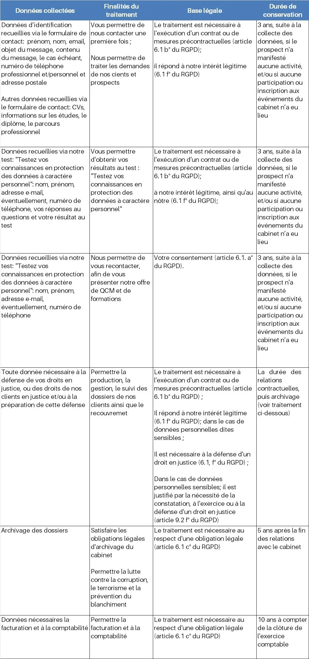 Certaines de vos données d’identification (votre nom et prénom, le numéro de votre dossier au sein du cabinet, votre adresse personnelle ou professionnelle) peuvent être conservées pendant une durée de 10 ans, afin de satisfaire les obligations légales du cabinet en matière de comptabilité.